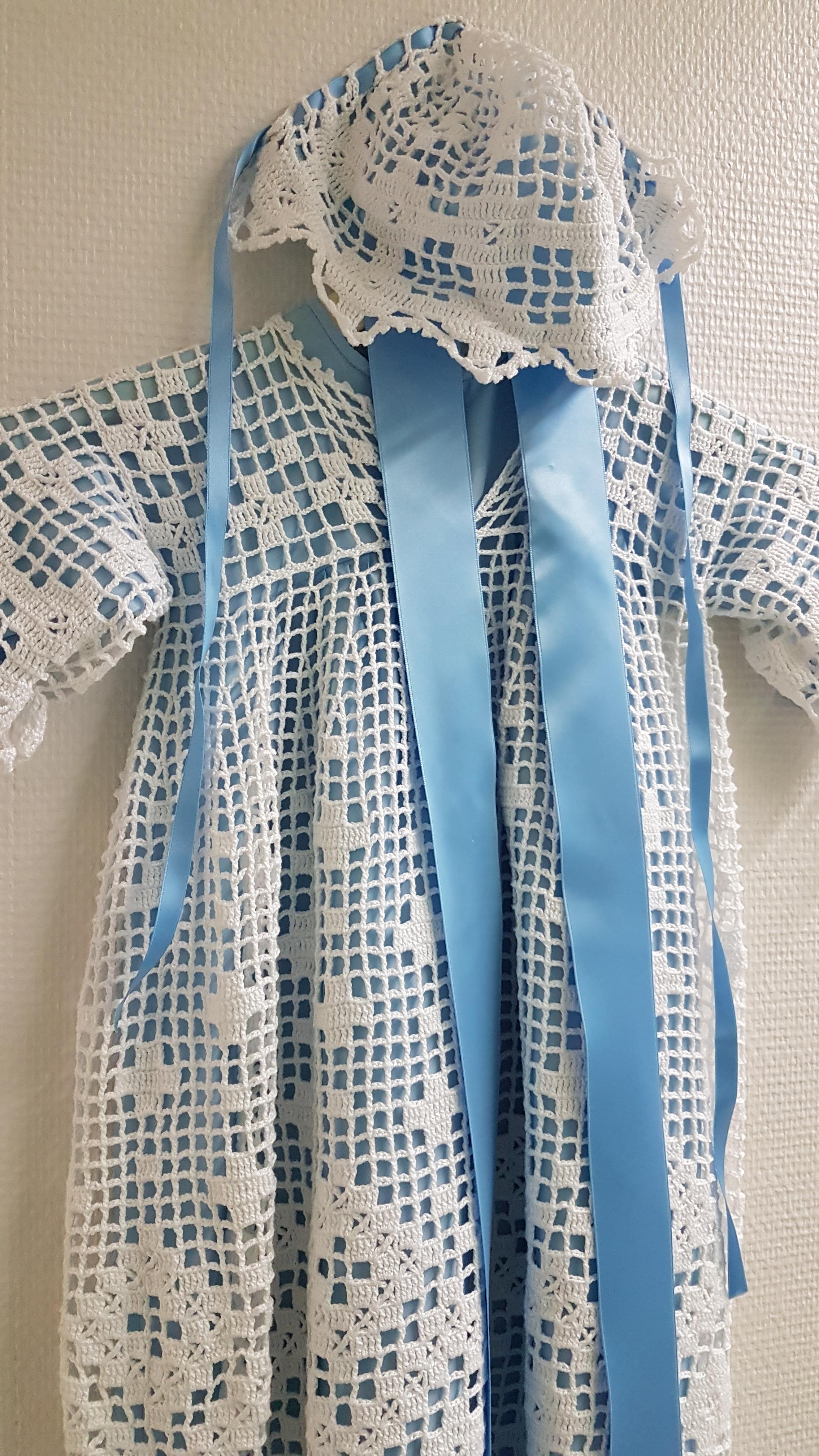 Vi har en nydelig heklet dåpskjole med lue som vi låner bort til dåp.